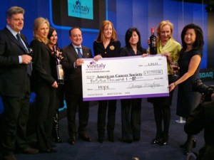 After closing NASDAQ, Marilisa Allegrini (second from right in yellow, holding magnum bottle) joined Cristina Mariani-May (second from left) when Giovanni Montovani, the CEO of Verona Fiere, home of VinItaly, donated $45,000 to the American Cancer Society.