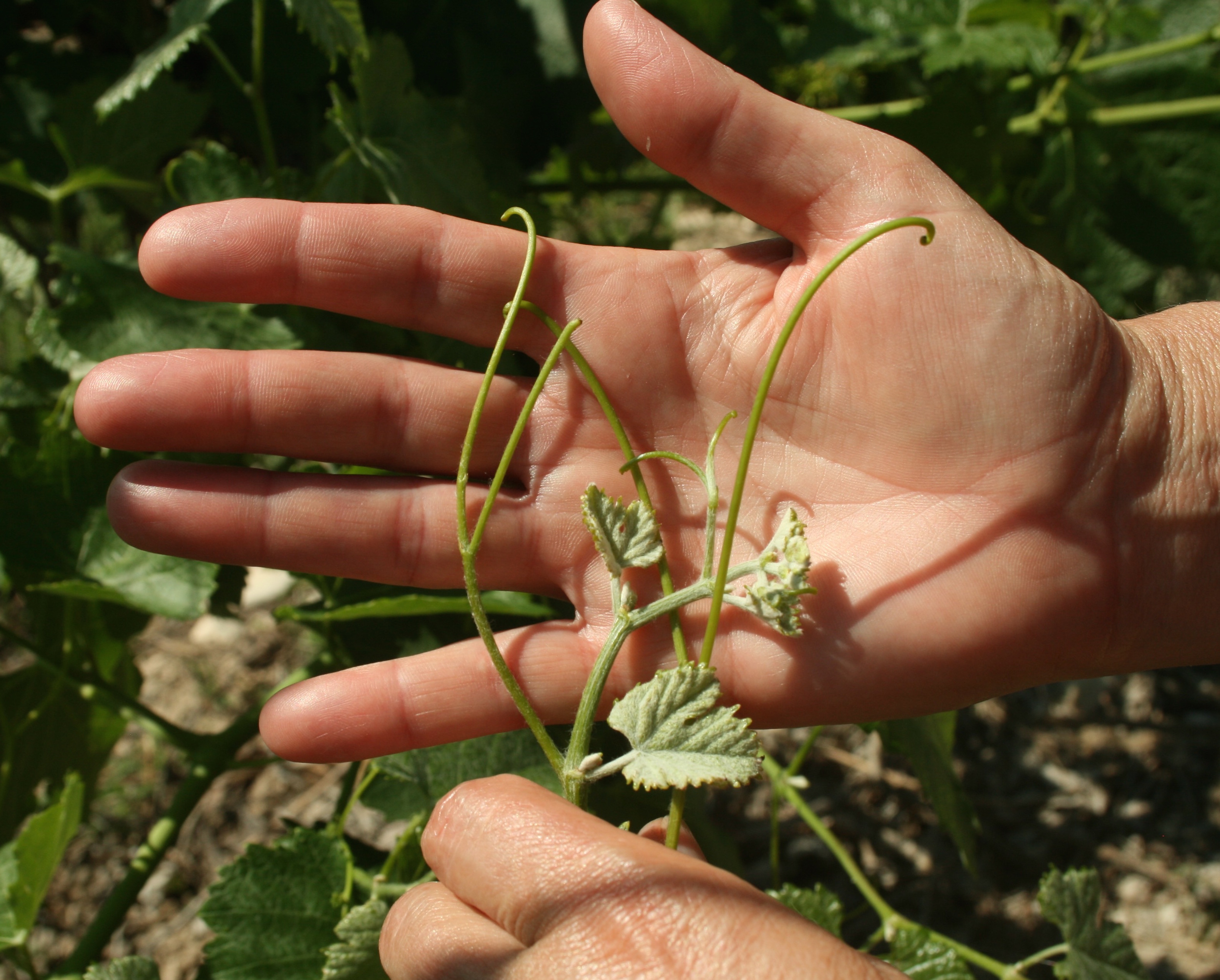 New tendrils on a Merlot vine at Whitewater Hill Vineyards. The long tips show vigorous growth but they are starting to brown, indicating the plant is turning more energy to fruit production and not new growth.